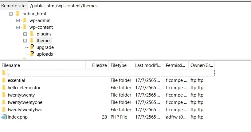 กรณีไฟล์ zip ใหญ่ หรือติดปัญหาใดๆ ในการ upload ลูกค้าสามารถแตกไฟล์ zip แล้วใช้โปรแกรม FTP ในการอัพโหลดไฟล์ขึ้นไปที่ path "public_html/wp-content/themes" แทนได้ตามภาพ (อ่านวิธีการใช้โปรแกรม FTP ได้ที่นี้)