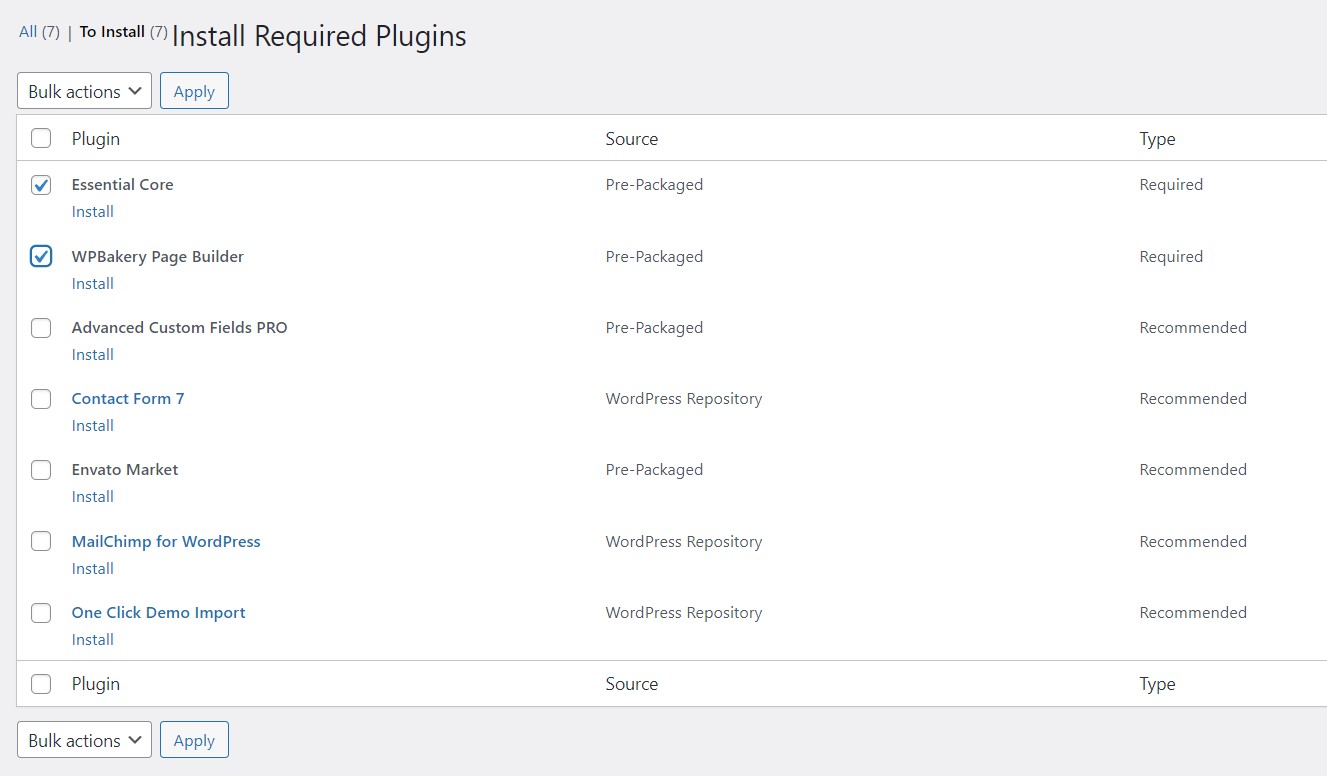 จากนั้นให้คลิกทุกตัวที่เขียน required ส่วนตัวอื่นๆ ที่คลิก recommend จะเลือกหรือไม่เลือกก็ได้ จากนั้นเลือก "Bulk Actions" เป็น "Install" แล้วกด "Apply"