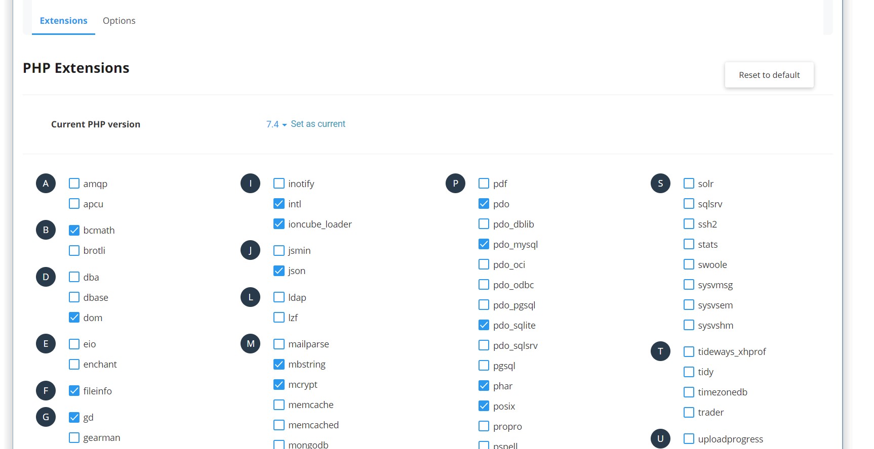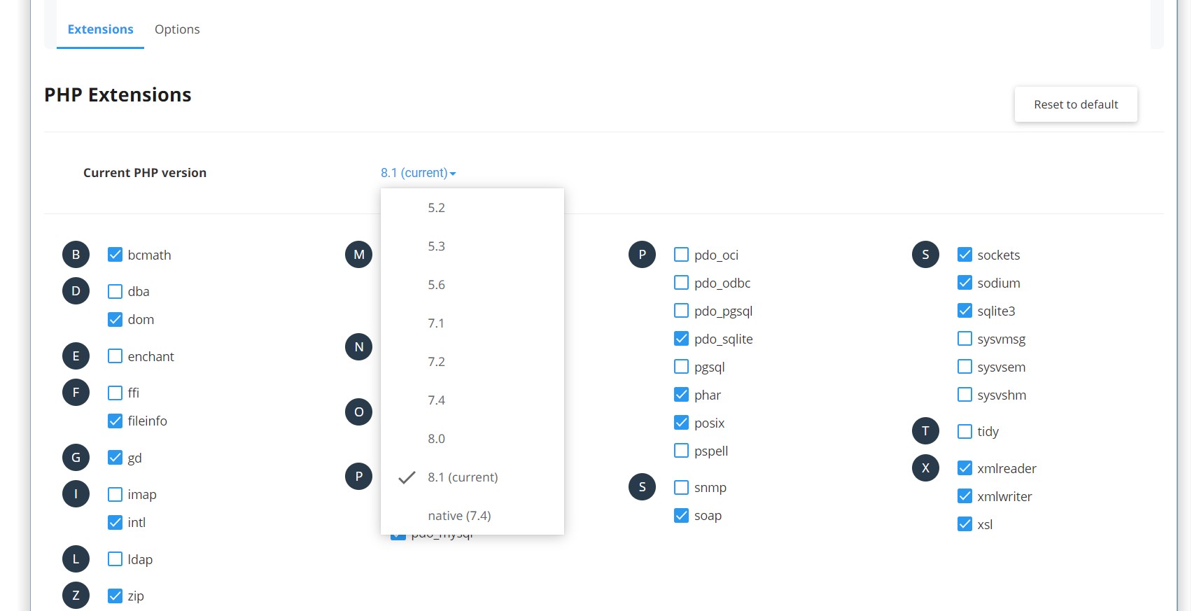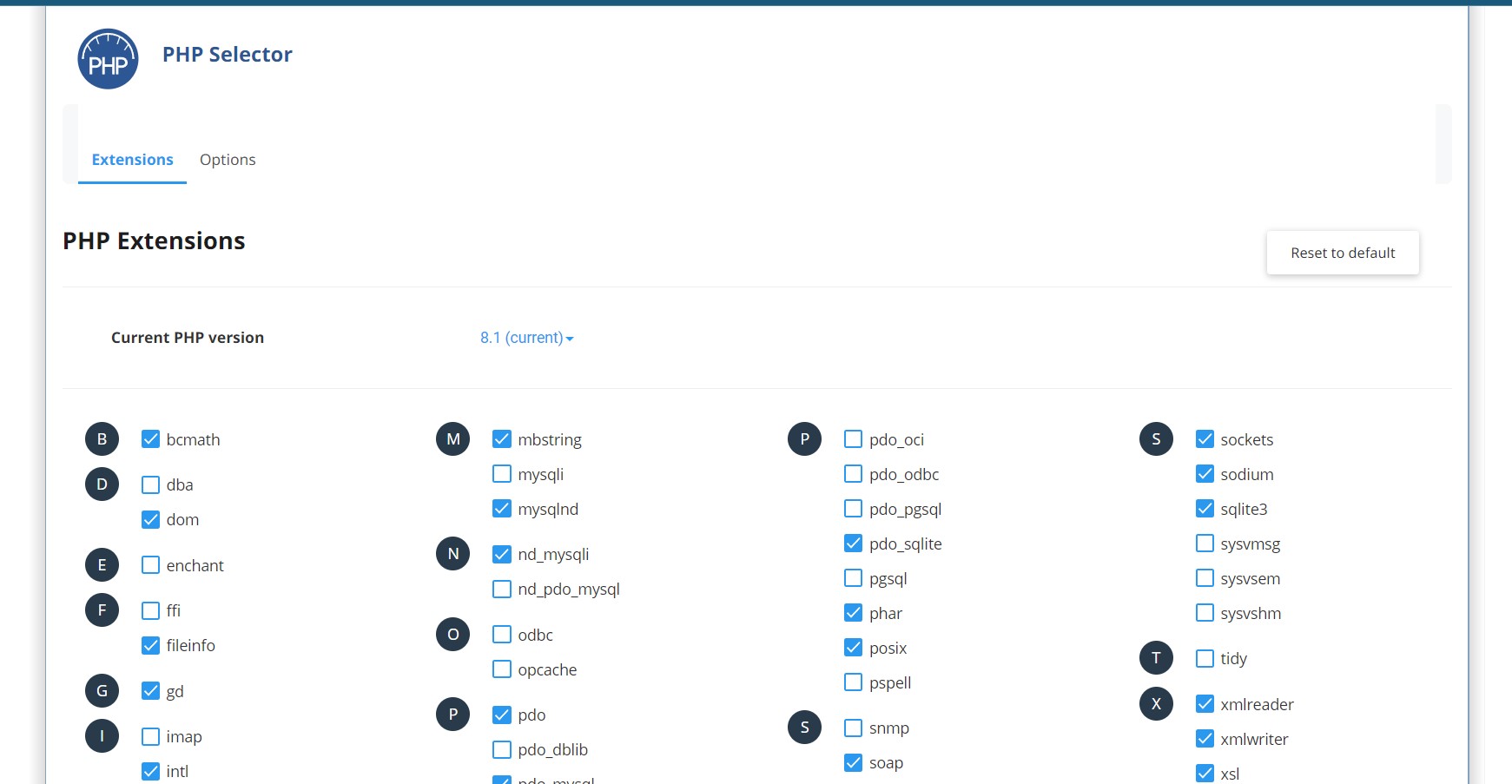 2. เมื่อเข้ามาหน้า PHP Selector ลูกค้าสามารถเลือก version ของ PHP ได้ตรง "Current PHP version" และในด้านล่างจะมี php extension ต่างๆ ให้เลือก (ซึ่งสามารถ reset to default ได้)