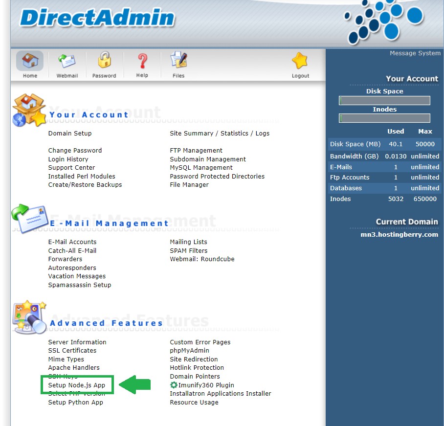 2. เข้าไปที่เมนู Advanced Features -> Setup Node.js App