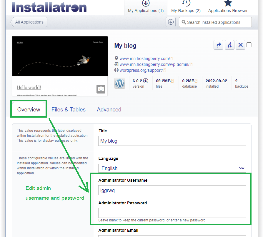 ที่แทป Overview เราสามารถกำหนดค่า Username/Password ของแอดมิน Blog ได้ใหม่ เมื่อตั้งค่าแล้วให้กดปุ่ม “Save All”