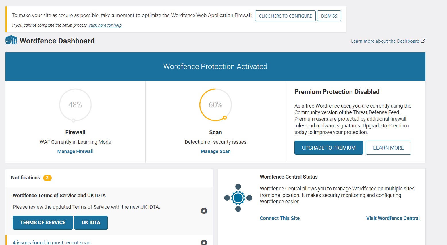 6. จะมีเมนู Wordfence ขึ้นมาใหม่ ให้ไปที่ Dashboard ก่อน