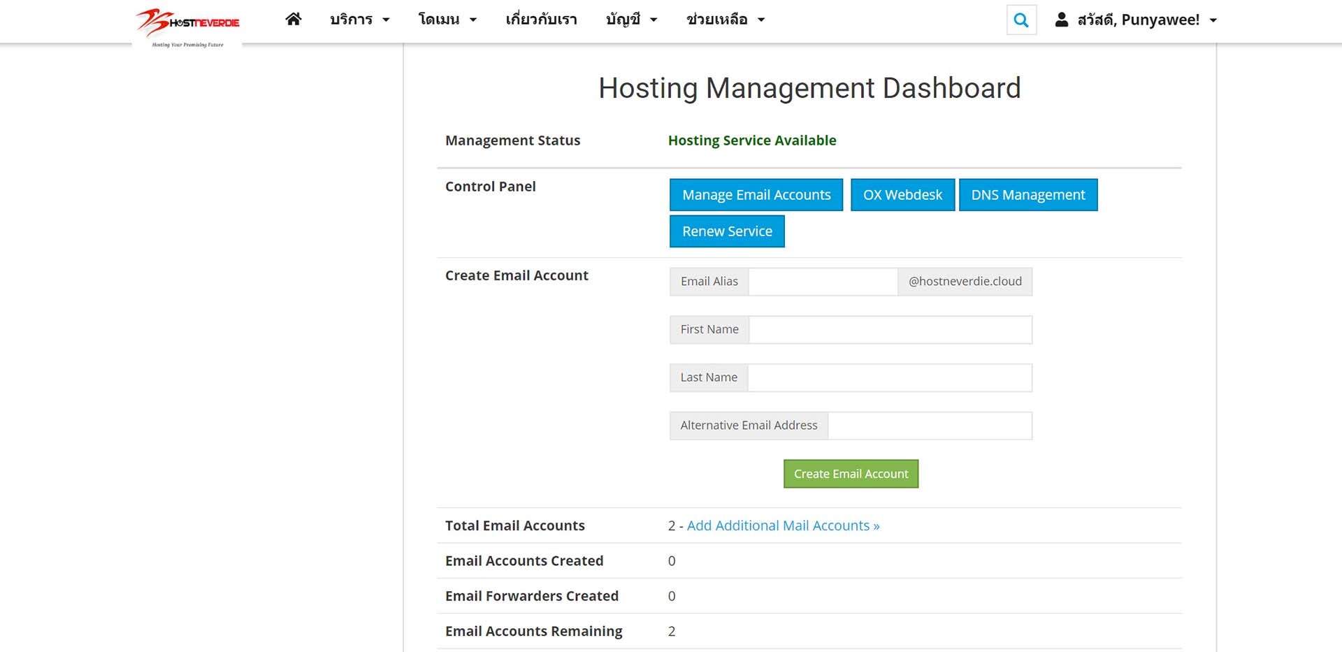 1. Login เข้า https://support.hostneverdie.com/ จากนั้นคลิกที่ "บริการ" (หากจำรหัสไม่ได้ให้ติดต่อ [email protected] หรือคลิกที่ reset รหัสผ่านระบบ)