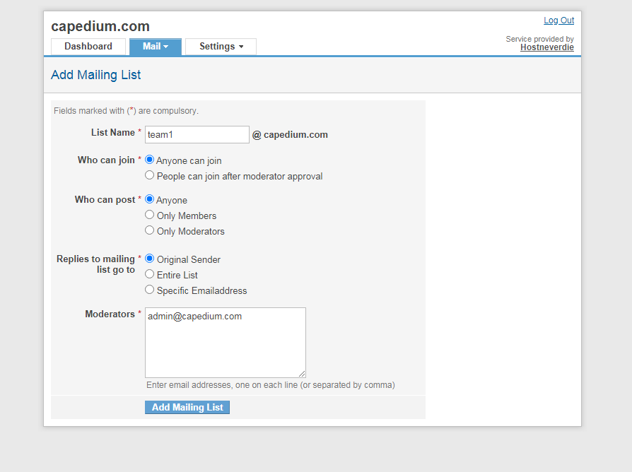 Mailing list คือกลุ่มรายชื่ออีเมล เช่น [email protected] เมื่อคุณส่งอีเมลไปยัง [email protected] Mailing List ดังกล่าวจะกระจายอีเมลไปให้กับอีเมลทุกอีเมลที่อยู่ในกลุ่ม Mailing List โดยอัตโนมัติ